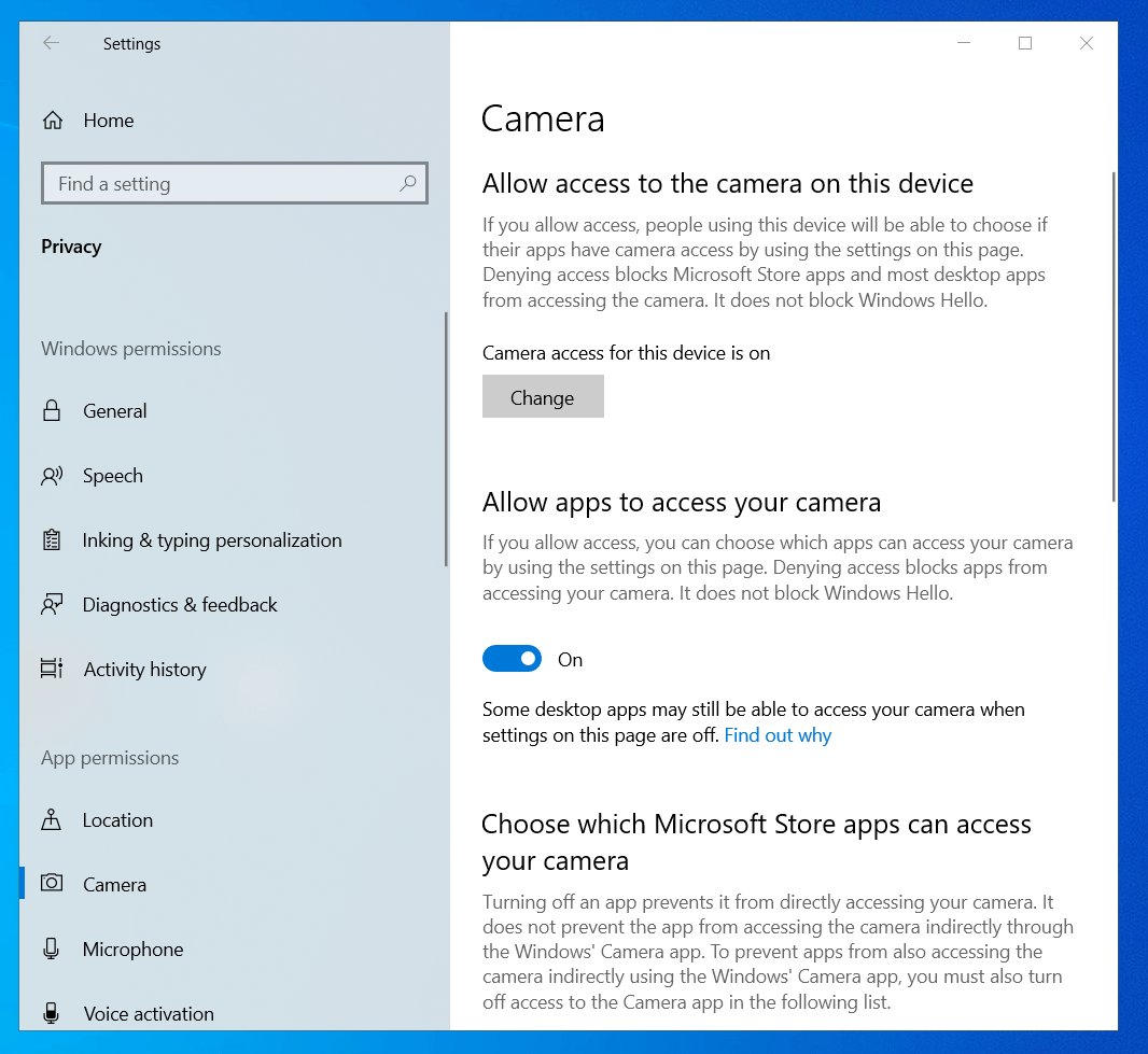 - Navigate to Privacy > Camera and check that the "Allow apps to access your camera" toggle is set to On. If not, enable the setting.