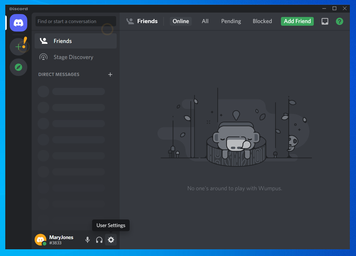 - Open Discord and click the Settings cog in the bottom-right corner.